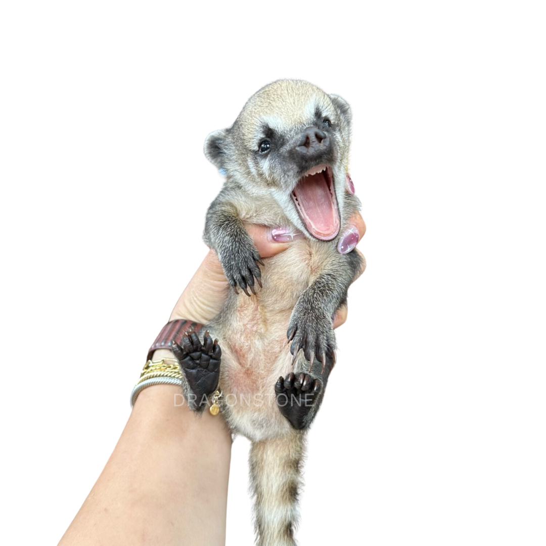 All of our mountain coati (also known as ring-tailed coatimundi) babies are hand-raised and extremely tame. Your coati baby will come with a care package, travel carrier, and breeder support for the lifetime of the animal. The care package includes premium canned food, primate biscuits, Fox Valley milk replacer, bottle & nipple, and a Dragonstone Exotics backpack to carry all the supplies. For an additional fee of $50, coati babies can receive a physical exam and health certificate issued by a licensed veterinarian before leaving our care. A health certificate is required for interstate travel.